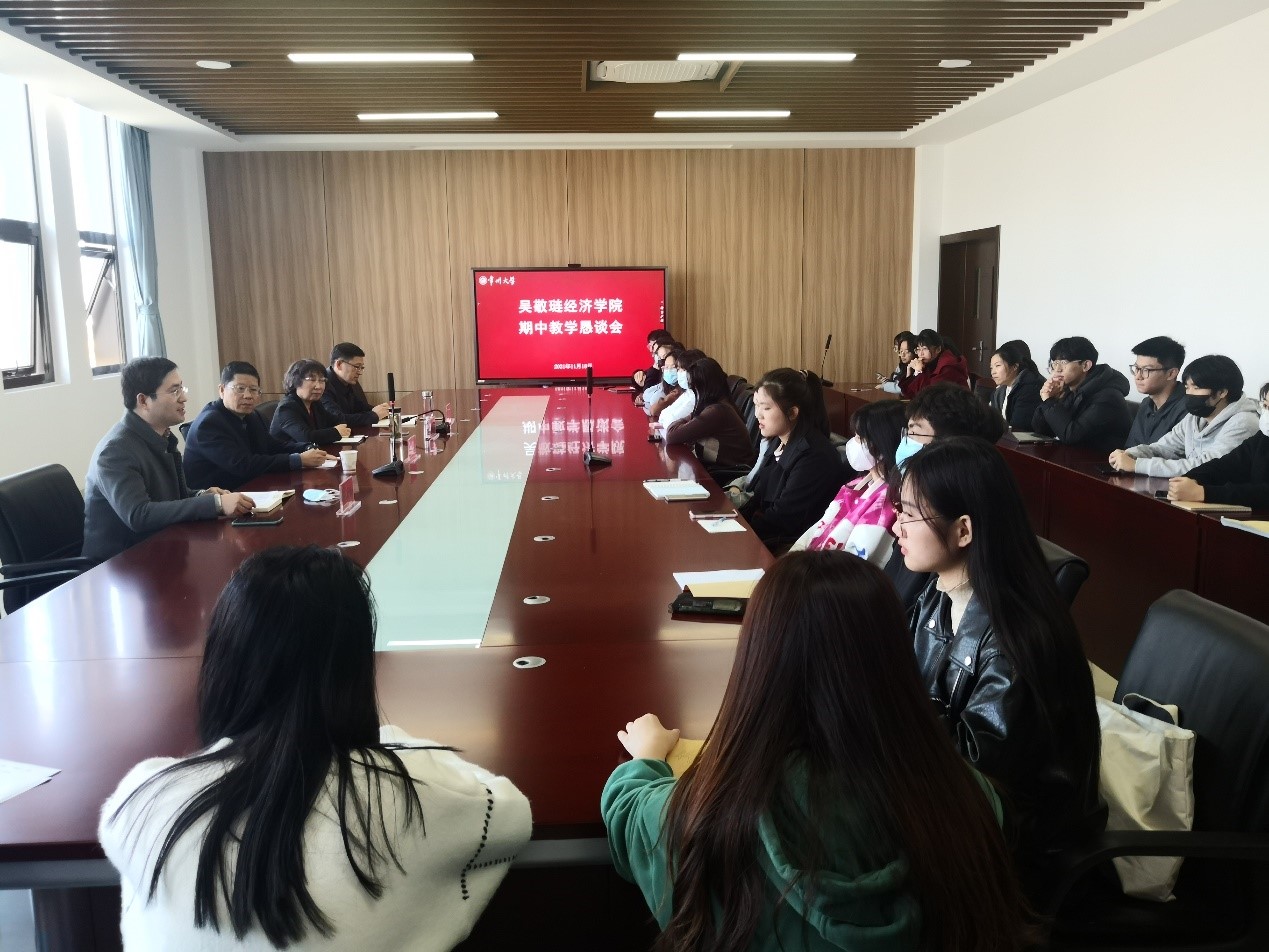 2021年11月18日,吴敬琏经济学院在各系已经召开期中教学恳谈会后,间隔半个月在立言楼427会议室,召开学院层面的期中教学恳谈会。会议由经济学院副院长任保全主持,会议邀请校督导王卫星教授、蔡建飞教授、院党委书记姜鸿教授、院长姜国刚教授现场指导,各专业各年级学生代表出席此次会议。会议针对各系期中教学恳谈会发现问题的整改落实情况进行反馈,并汇总未解决的老问题和新问题,会后逐一反馈、整改和落实。通过学院层面的期中教学恳谈会,集中精力就学生关注的难点问题进行集中反馈和办理。