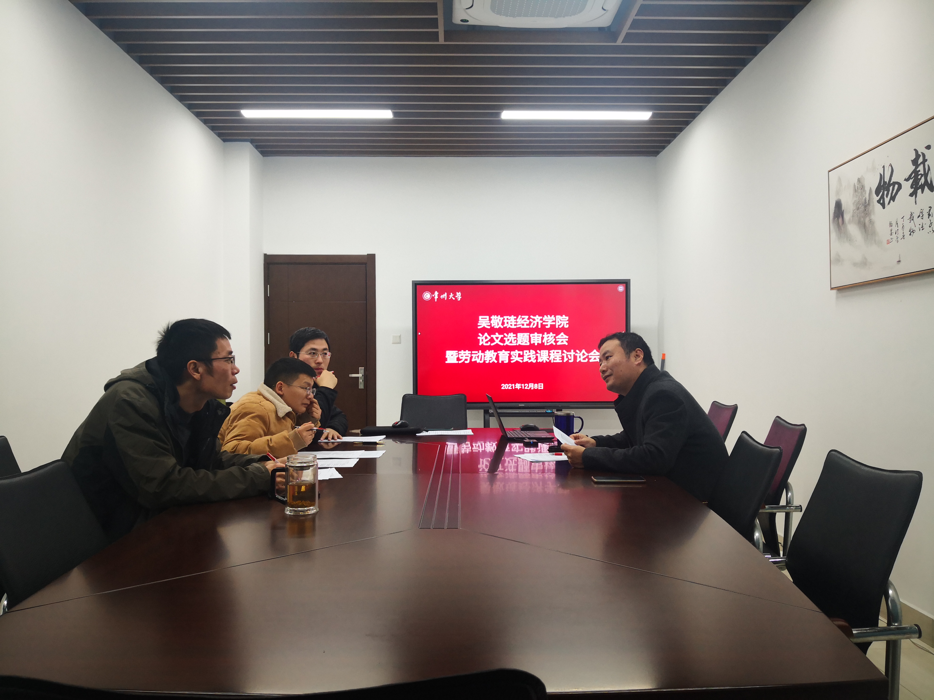 2021年12月8日中午,吴敬琏经济学院在立言楼419会议室召开论文选题审核会和劳动教育实践课程研讨会。会议由任保全副院长主持,国贸系主任管志杰、金融系主任曹启龙、和金工系主任姚惠泽出席会议。