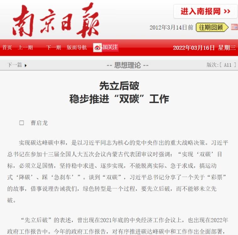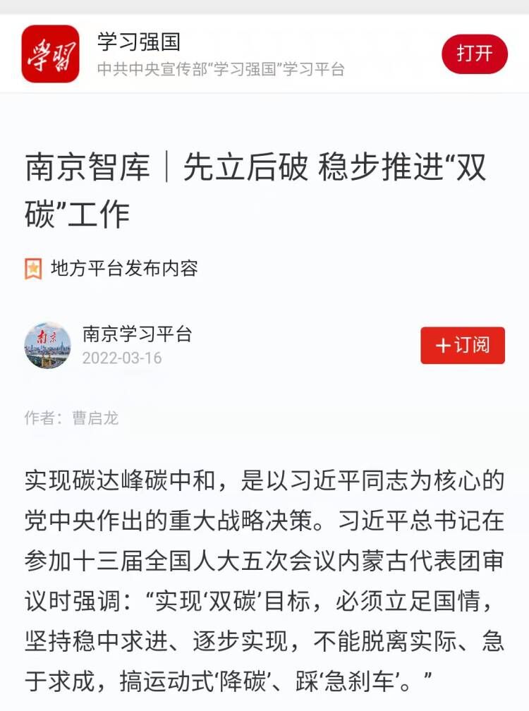 近日,我校“江苏能源战略研究基地”骨干研究人员、吴敬琏经济学院院长助理曹启龙副教授撰写的智库报告《先立后破、稳步推进“双碳”工作》刊登于“南京日报”3月16日A11版,并被“学习强国”平台栏目采纳。
