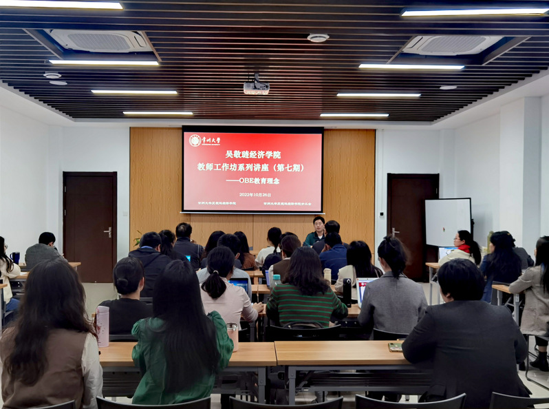 2022年10月26日下午,由吴敬琏经济学院教学指导委员会和学院工会主办的教师工作坊第七期讲座《目标导向教育OBE教育理念》,在立言楼403举行。本次讲座由任保全副院长主讲,全院教师参加此次培训。
