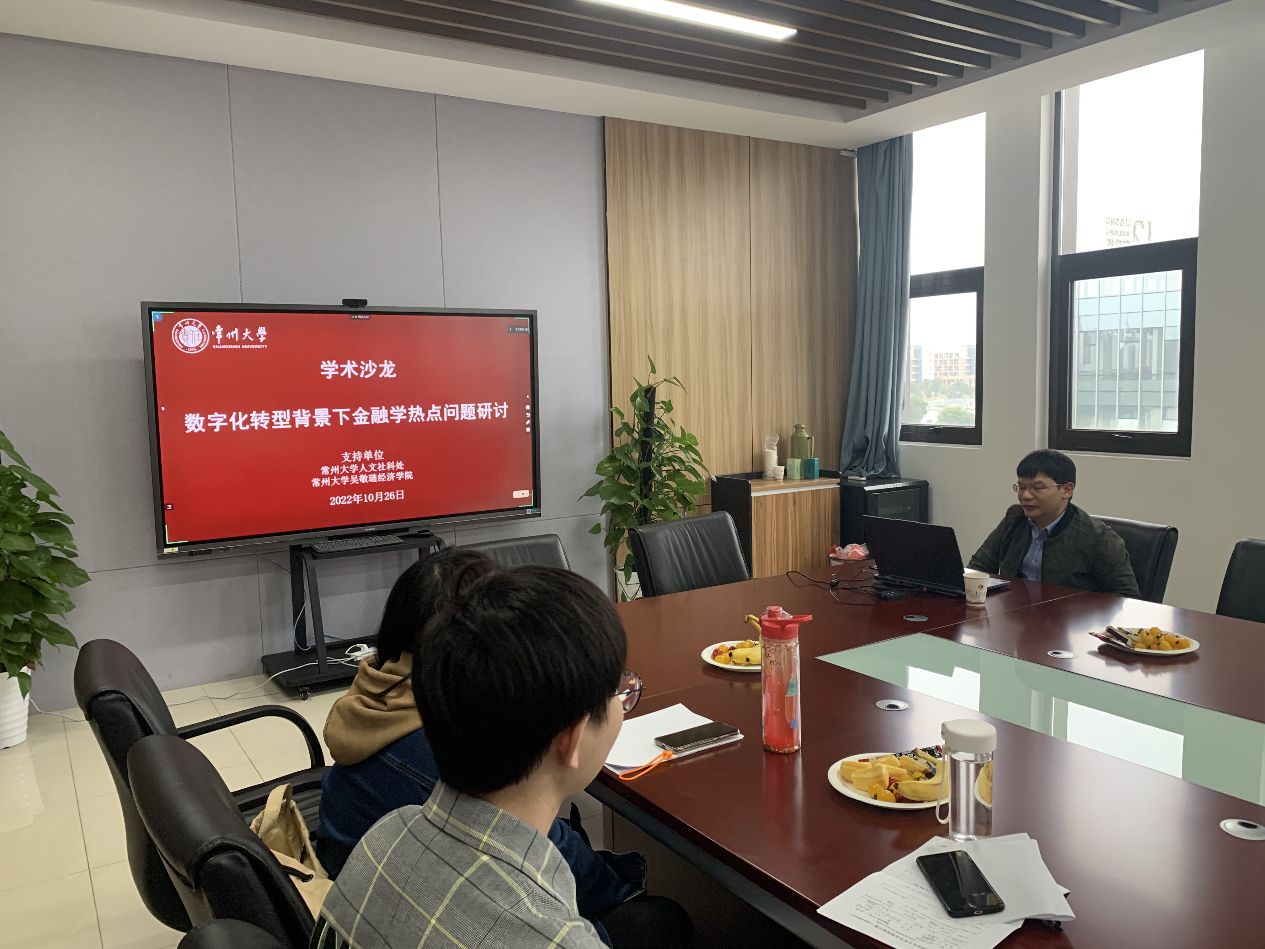 10月26日下午,学术沙龙“数字化转型背景下金融学热点问题研讨”在立言楼427会议室顺利举行。沙龙以线上线下相结合的方式进行,吴敬琏经济学院教师、商学院部分研究生共30余人参与了沙龙讨论。此次沙龙,由常州大学人文社科处、常州大学吴敬琏经济学院赞助支持。