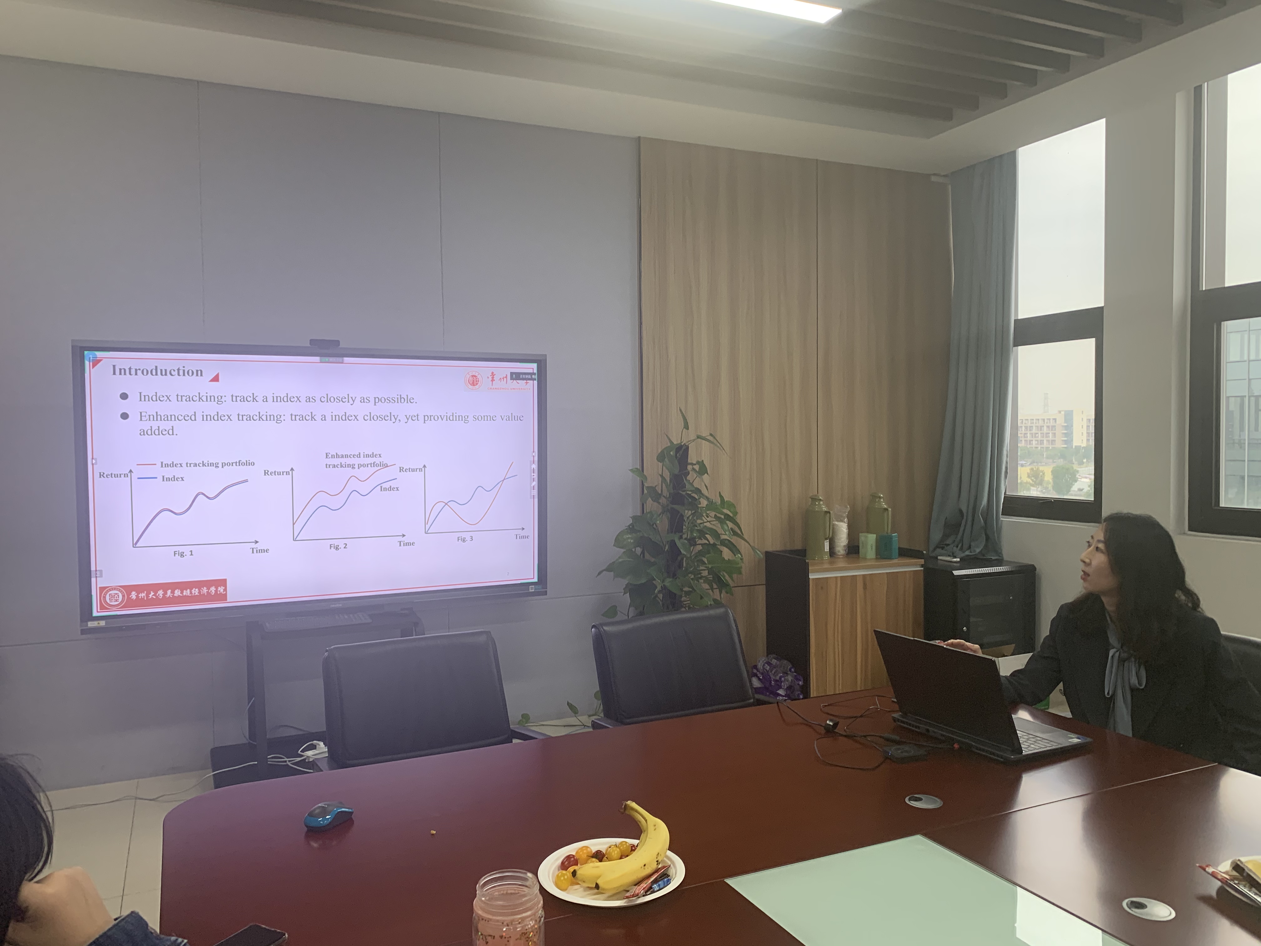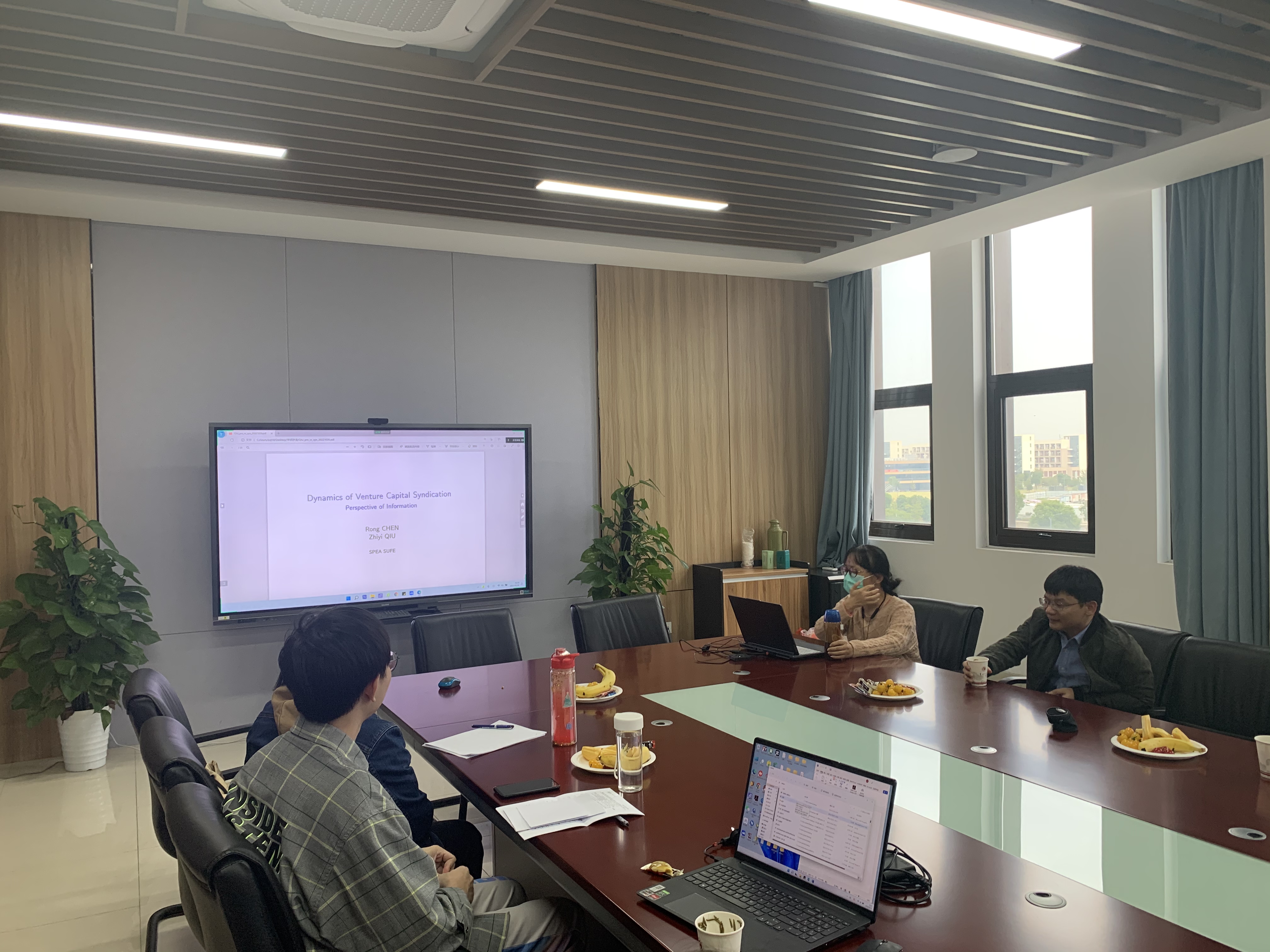 沙龙共分为两个环节:第一个环节是主题发言。吴敬琏经济学院曹启龙老师做了主题为《The effect of managerial myopia on long-term investment: Evidence from China》的主题报告,邱知奕老师做了主题为《Dynamics of Venture Capital Syndication:Perspective of Information》的主题报告,杨婷婷老师做了主题为《Two new mean–variance enhanced index tracking models based on uncertainty theory》的主题报告。第二个环节是交流环节,与会教师针对主题发言或者犀利提问、或者给出中肯的意见和建议、或者表达了进一步交流学习的意见。最后,与会教师针对研究生的开题报告、毕业设计进行了点评。