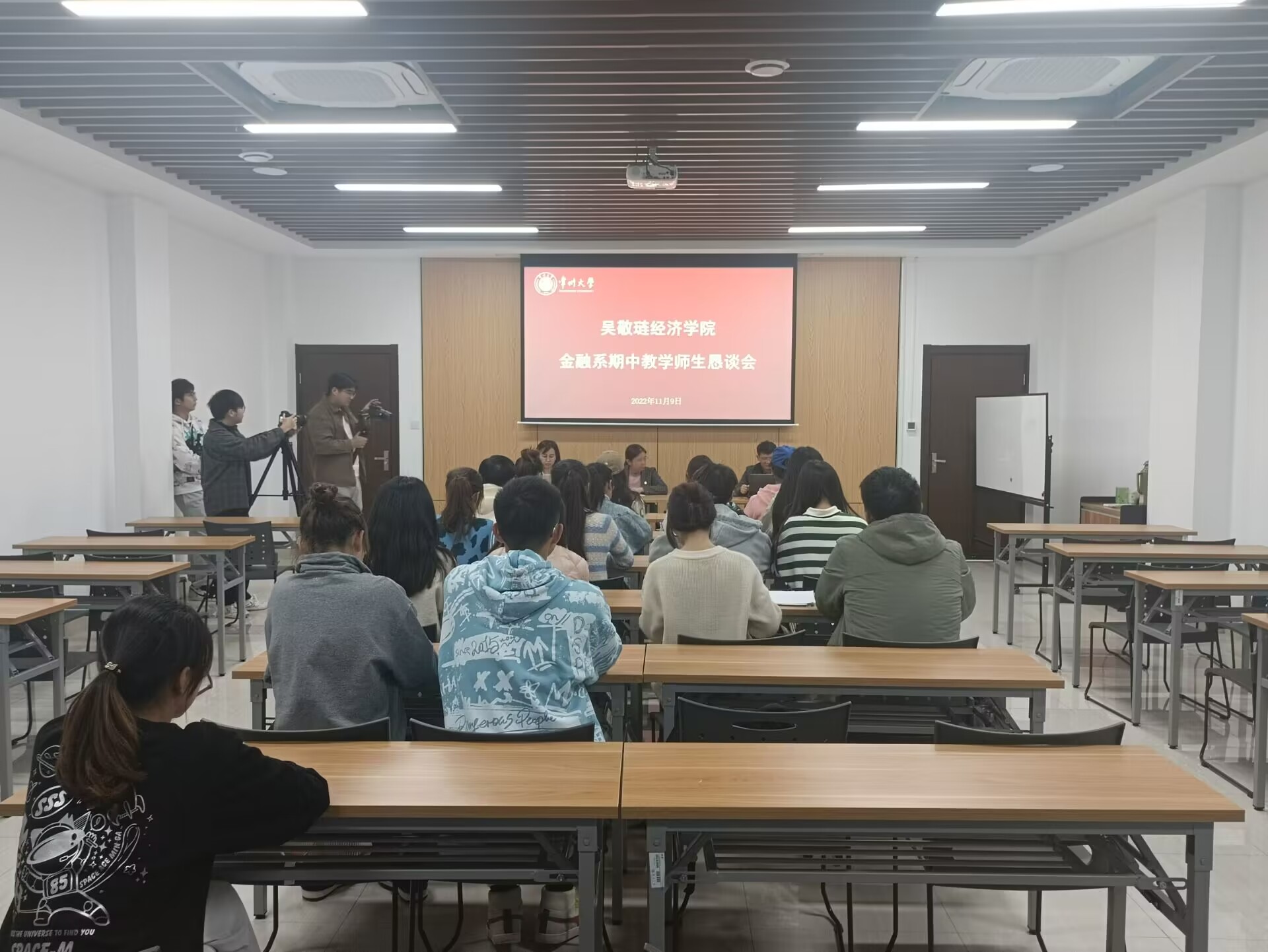 2022年11月9日,金融学专业在吴敬琏经济学院403会议室召开了学生期中座谈会。张普副院长、金融学专业负责人曹启龙老师、熊永莲老师和金融专业2019级至2022级学生代表参与了此次座谈。