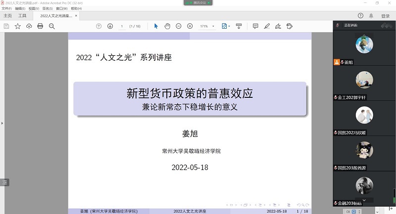 2022年5月18日晚7点半,经济学院举办人文之光系列讲座“新型货币政策的普惠效应——兼论新常态下稳增长的意义”。本次讲座通过腾讯会议采取线上方式进行,由经济学院姜旭博士主讲,经济学院本科生参加了本次讲座。讲座主要内容包括对于新型货币政策的介绍、新型货币政策的普惠效应、以及新常态下稳增长的意义。该讲座旨在培养学生的学习兴趣,加深学生对于宏观经济政策的理解,拓展思维、开阔眼界。(文/姜旭 摄/姜旭 审核/任保全)