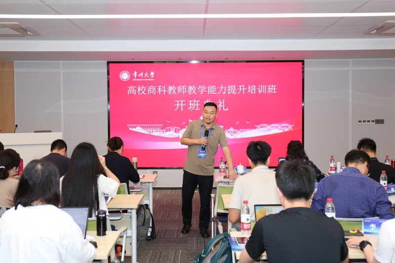 开班仪式由王文华院长主持。他在开班动员词中深刻剖析了数智时代商科教育面临的机遇与挑战,强调了教育革新对于培养新时代商科人才的紧迫性与战略意义。王文华院长勉励全体参训教师珍惜此次学习契机,主动更新教育教学理念,积极掌握前沿教学方法,着力推动理论知识与行业实践的深度融合,切实增强教书育人的核心本领。他同时殷切期望参训教师能做到学有所成、学以致用,将培训所得转化为提升学院商科人才培养质量的实际成效,为培育适应未来社会发展需求的卓越商科人才贡献智慧与力量。现场氛围热烈浓厚,教师们备受鼓舞,纷纷表示将以饱满的热情投入到培训学习中。