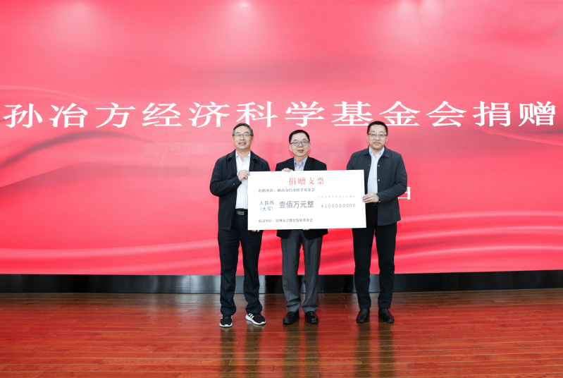 李剑阁理事长代表孙冶方经济科学基金会向常州大学教育发展基金会和吴敬琏经济学院捐赠100万元成立“吴敬琏奖学金”,学院院长姜国刚接受捐赠,徐守坤向李剑阁理事长颁发捐赠证书。
