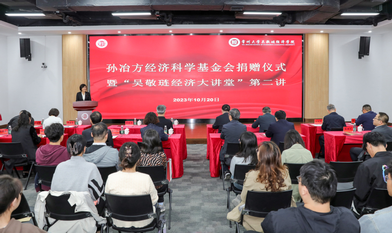 2023年10月20日,孙冶方经济科学基金会捐赠仪式暨“吴敬琏经济大讲堂”第二讲在常州大学西太湖校区立言楼458报告厅隆重举行。孙冶方经济科学基金会理事长李剑阁、孙冶方经济科学基金会理事长顾问葛俊、中信出版集团《比较》杂志副主编吴素萍、光洋股份董事长李树华、孙冶方基金会办公室副主任岳为民应邀出席。常州大学党委书记徐守坤、副书记黄海燕、学院党政班子成员、教师和本科生研究生代表100余人参加活动。会议由校党委副书记黄海燕主持。