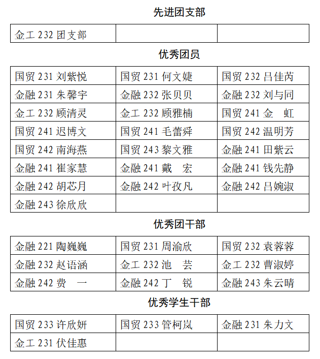 根据《关于开展2025年度团内评优的通知》相关要求,经个人申报、单位推荐、民主评议、学院审核等环节,拟推荐先进团支部1个,优秀团员22名,优秀团干部9名,优秀学生干部4名。若有不同意见者请于2026年3月20日之前,以口头或书面形式向吴敬琏经济学院学工办反映,联系电话:0519-88519208,地址:立言楼413办公室。现将拟推荐名单汇总如下: