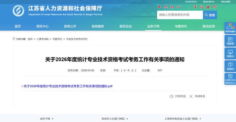 关于2026年度统计专业技术资格考试考务工作有关事项的通知